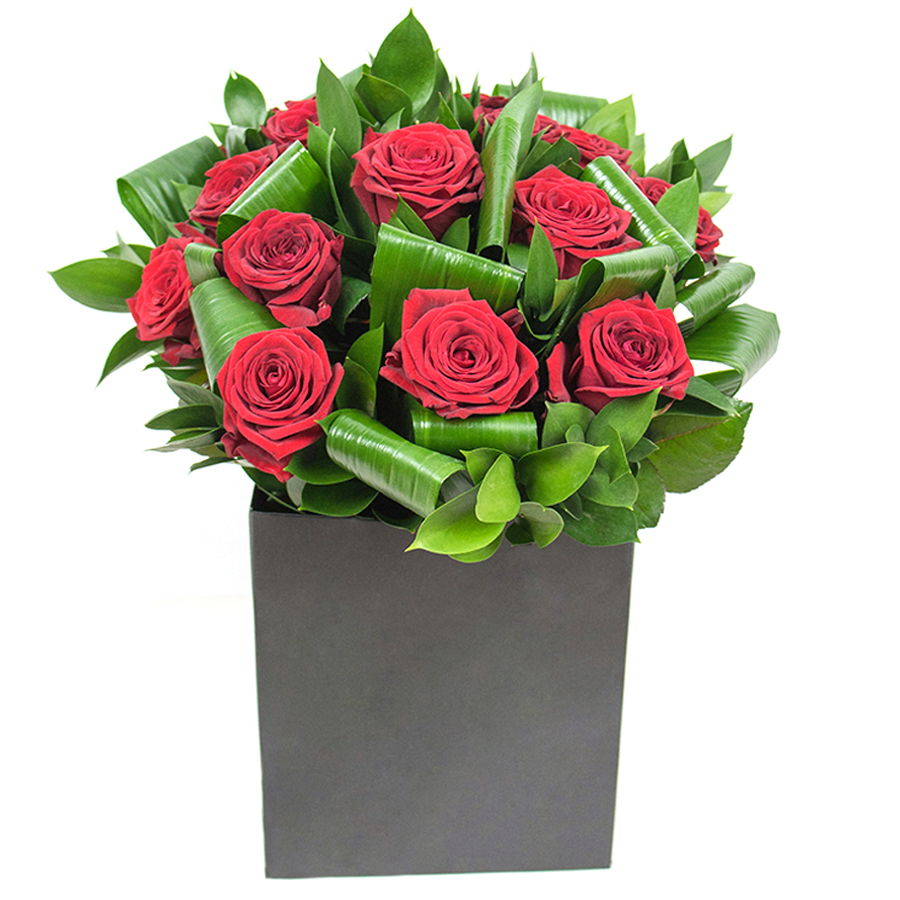 Enhance your living space with our stunning bouquet, artfully combining radiant red roses, vibrant aspidistra leaves, and graceful ruscus. This unique arrangement is designed to bring both beauty and sophistication to any room.